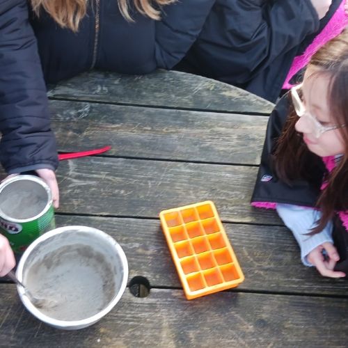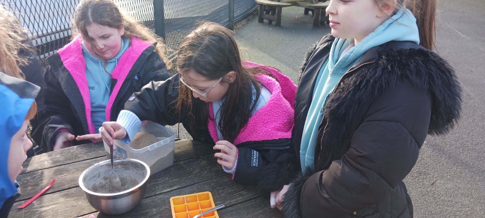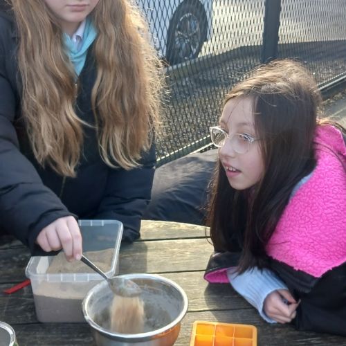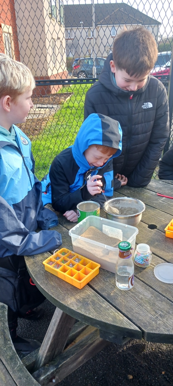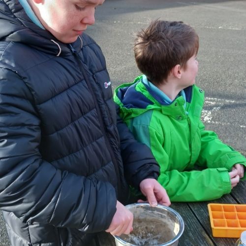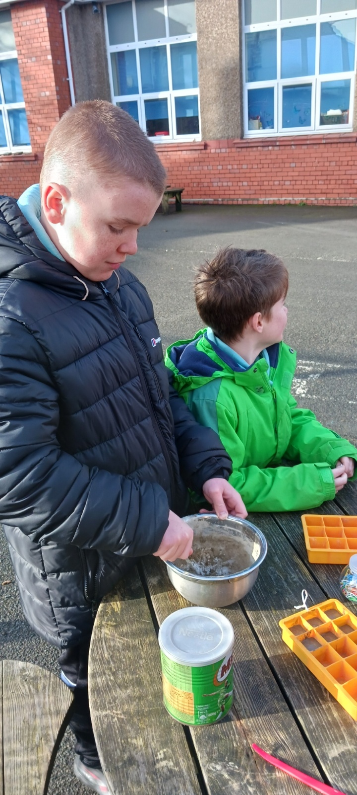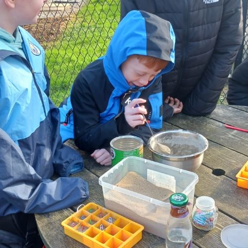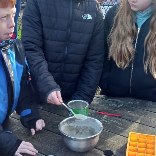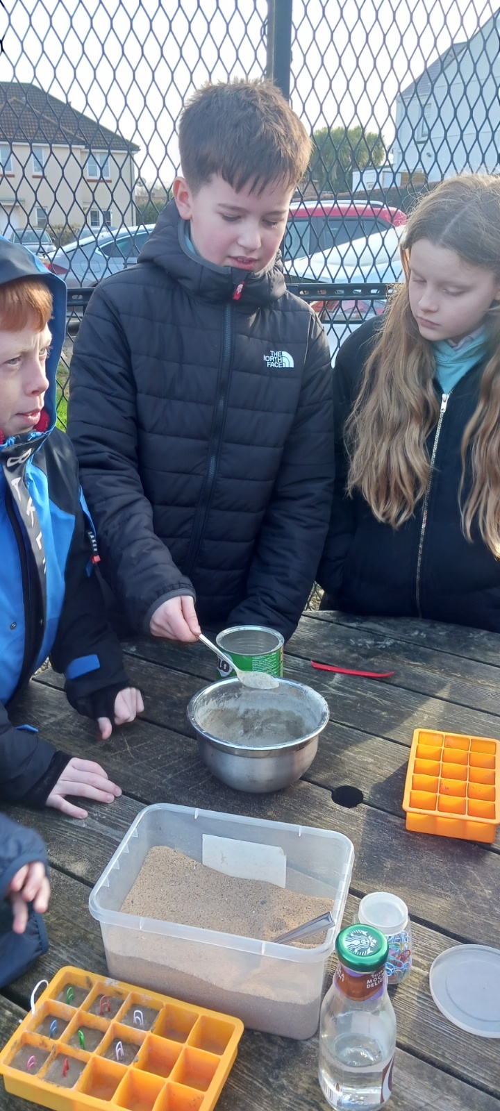 Sea Holly have been earning their stripes on site, with their concrete mixing skills today.  They decided on their ratio of sand:cement:water and got to mixing.  They used their mix to create some useful little photo holders.  Gwaith ardderchog!